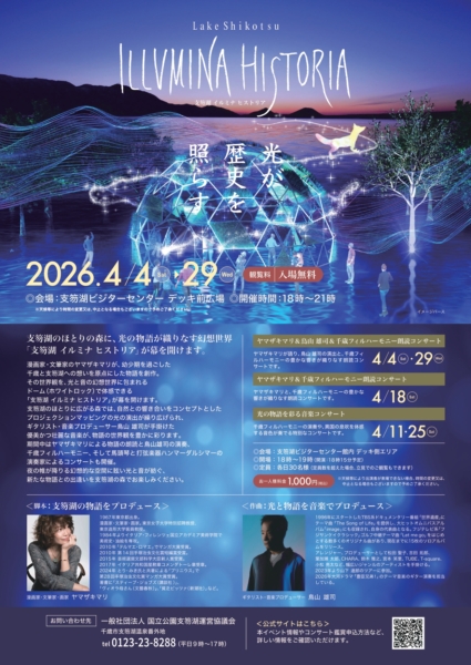 本イベントでは、漫画家・文筆家のヤマザキマリ氏が書き下ろした特別な物語を、ギタリスト・音楽プロデューサーの鳥山雄司氏が手がけた音楽にのせてお届けします。日本屈指の水質を誇る支笏湖の美しさを背景に、会場を光のアートで彩り、訪れる皆さまを神秘的な世界へと誘います。